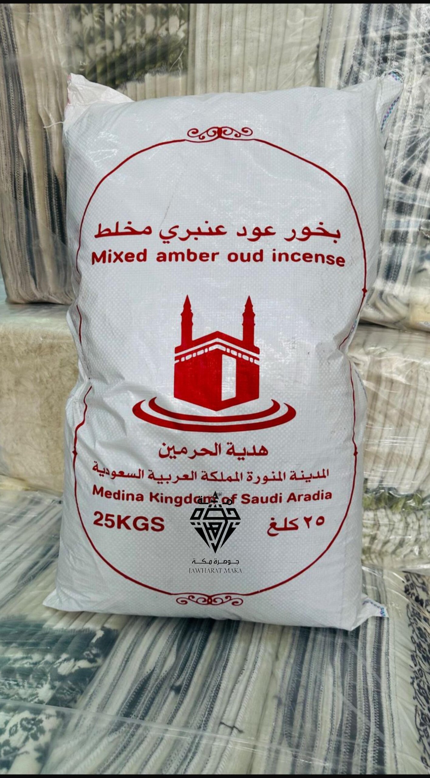 بخور عود عنبري مخلّط معبأ في كيس كبير مخصص للاستعمال التجاري، يتميز برائحة دافئة تجمع بين فخامة العود ونعومة العنبر، ما يمنحه عبقًا ثابتًا وقويًا يدوم طويلًا.