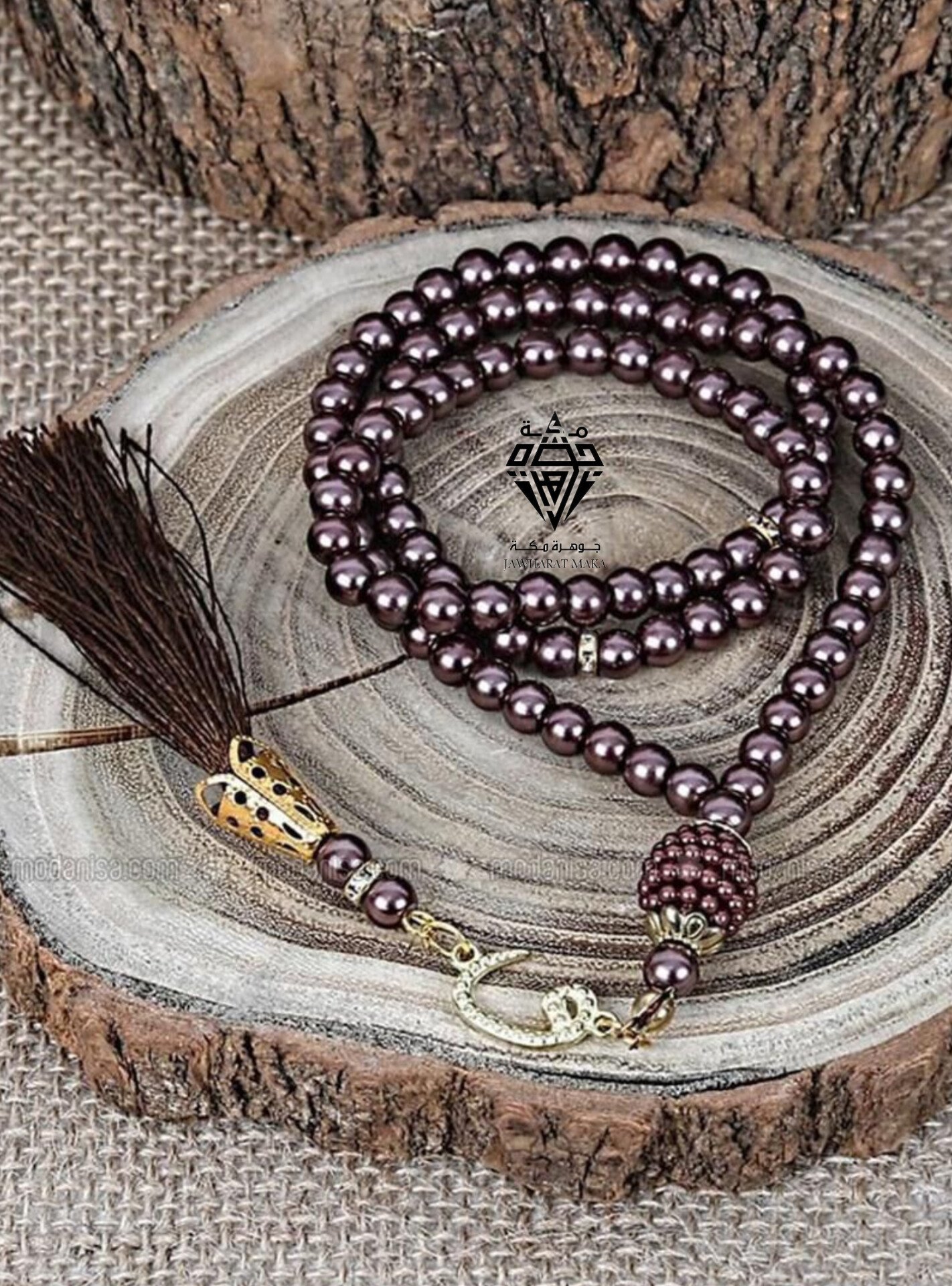 سبحة أنيقة بطابع فاخر بلون بني مائل للموف بلمعة راقية، مصنوعة من خرز دائري متناسق يعكس جودة الصقل ودقة التشطيب. تتوسطها خرزة مزخرفة مميزة تضيف لمسة فنية جذابة، مع تفاصيل معدنية ذهبية اللون تعزز إحساس الفخامة.