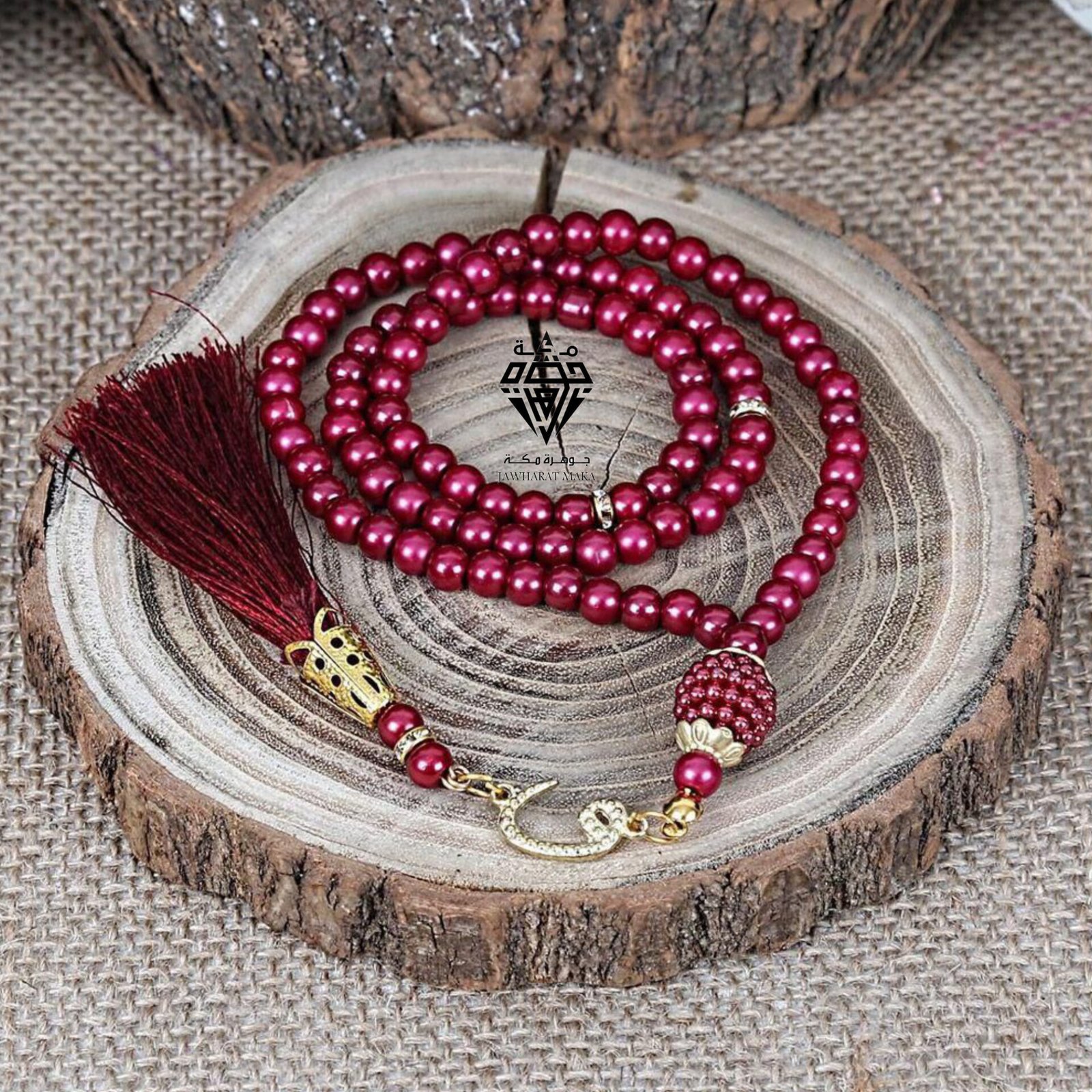 سبحة أنيقة وفاخرة بلون خمري لامع، مصنوعة من خرز دائري متناسق يعطي إحساسًا بالرقي والنعومة. تتوسطها خرزة مميزة مزخرفة تضيف لمسة فنية جذابة، مع إكسسوارات معدنية ذهبية اللون تزيدها فخامة وأناقة.
