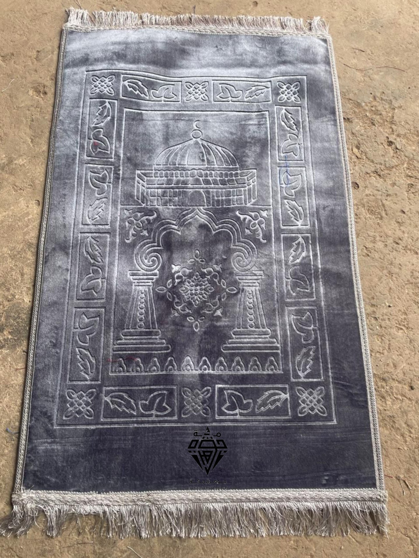 سجادة صلاة فاخرة باللون الرمادي الداكن بتدرجات أنيقة تمنحها مظهراً راقياً وعصرياً. تتوسطها رسمة بارزة لقبة مسجد مع محراب مزخرف وأعمدة كلاسيكية، محاطة بإطار من نقوش نباتية وهندسية دقيقة تعكس الطابع الإسلامي التقليدي.