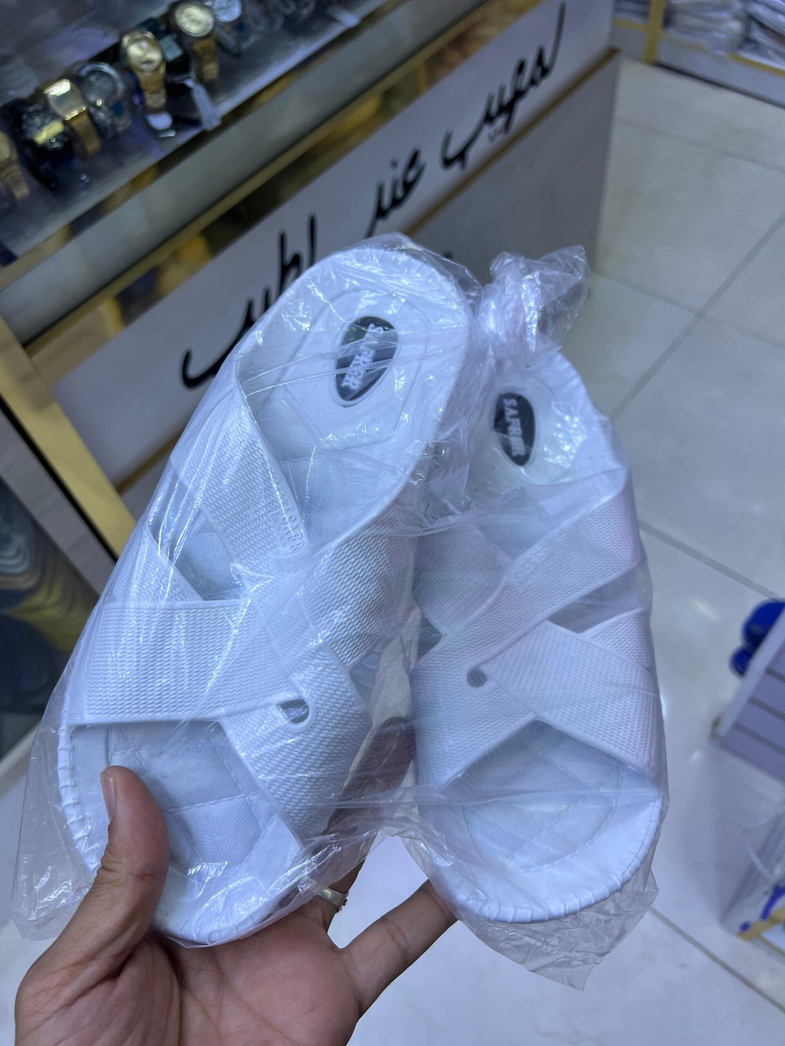 الصورة شبشب/صندل أبيض بتصميم عملي وبسيط، مصنوع من خامة خفيفة ومتينة مع أشرطة عريضة متقاطعة تمنح ثباتًا جيدًا للقدم. يتميز النعل بسطح مبطن ومريح يساعد على امتصاص الضغط أثناء المشي، مع نقشة سفلية تقلل من الانزلاق.