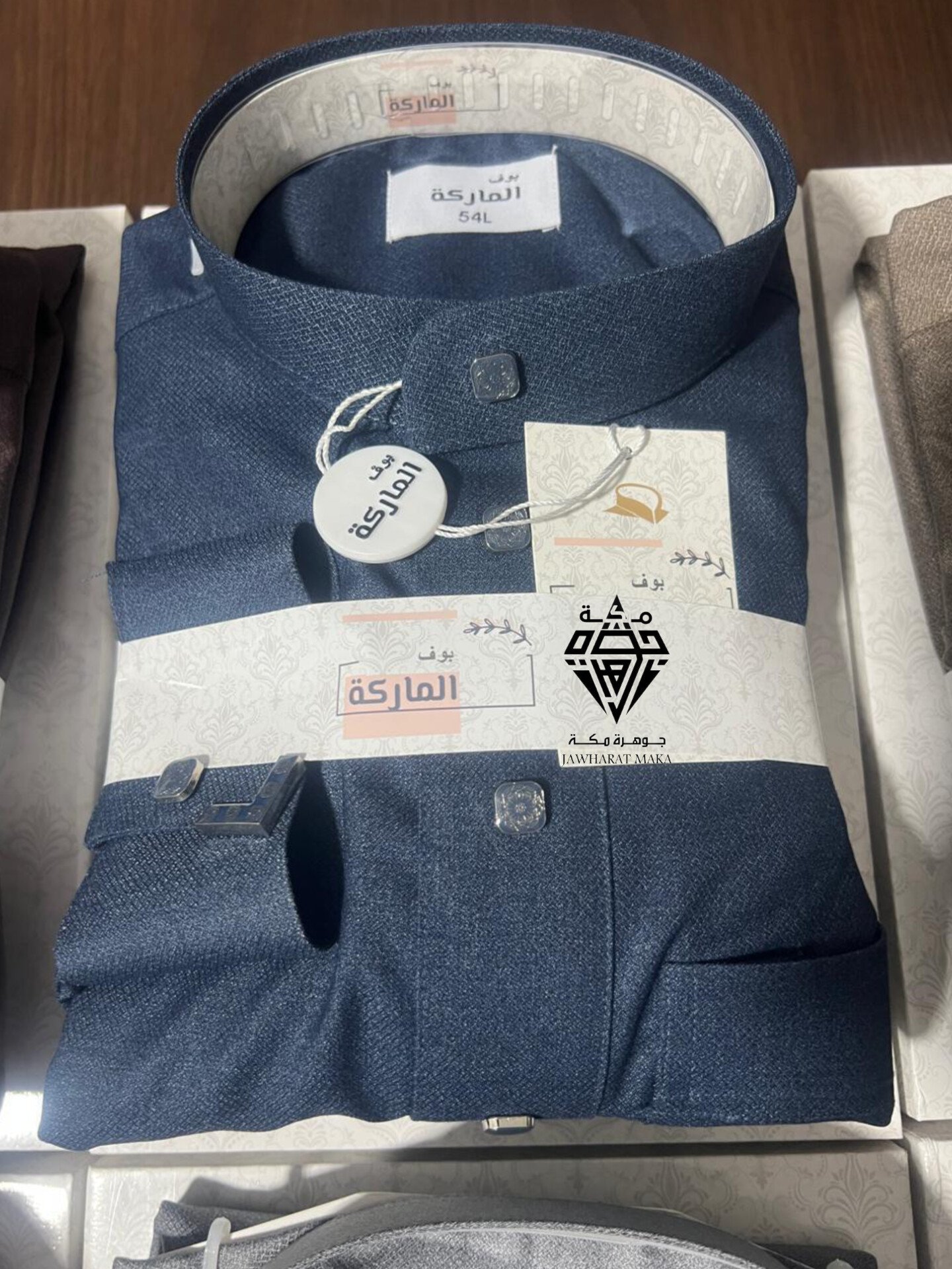 يتميز بقماش عالي الجودة بنقشة خفيفة تعكس الذوق الرفيع، مع ياقة عصرية وأزرار مربعة أنيقة تضيف لمسة فاخرة للتصميم. كما يأتي بأكمام مزودة بأزرار معدنية أنيقة تزيده تميزاً.