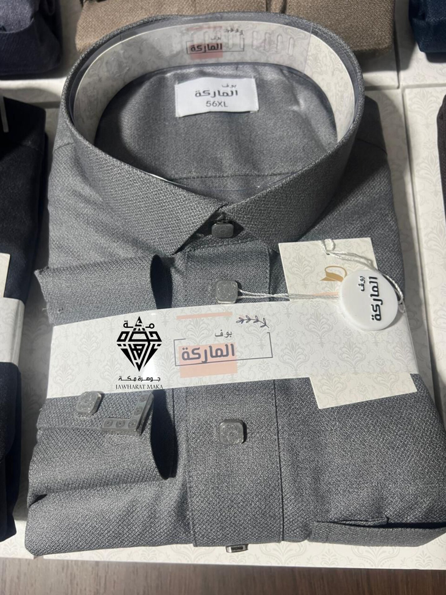 يتميز بقماش عالي الجودة بنقشة دقيقة تضيف لمسة فخامة واضحة، مع ياقة كلاسيكية مرتبة وأزرار مربعة أنيقة متناسقة مع لون القماش. كما أن أزرار الأكمام المعدنية تزيده تميزًا وتعكس الاهتمام بأدق التفاصيل.