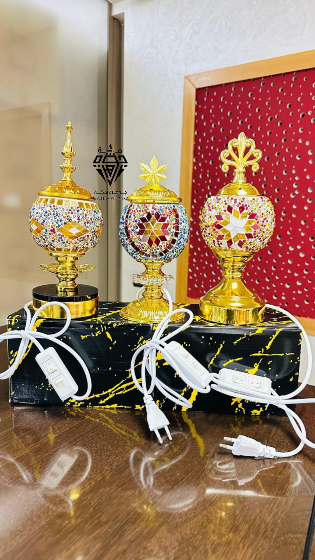 تتميز المباخر بهيكل ذهبي لامع يعكس الفخامة، مع كرة علوية مزينة بزخارف فسيفسائية ملونة بأشكال هندسية جميلة (نجوم وزخارف عربية دقيقة) تضيف لمسة فنية راقية. كل مبخرة لها تصميم غطاء مختلف، ما يمنح كل قطعة طابعًا خاصًا ومتفردًا.