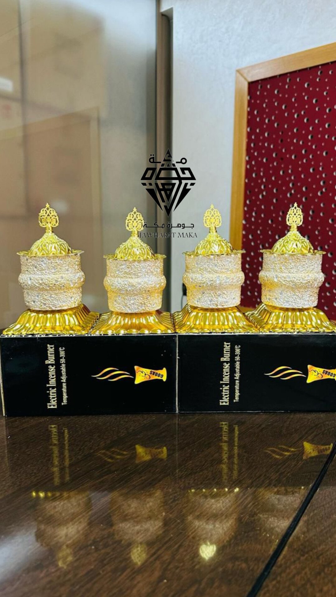 تتميز بقاعدة ذهبية لامعة بتفاصيل منقوشة بدقة، مع جسم مزخرف بنمط فاخر يجمع بين اللون الذهبي واللمسة البيضاء المحببة التي تعكس الفخامة. الغطاء العلوي مزين بزخرفة شرقية أنيقة تضفي عليها طابعًا تقليديًا راقيًا.