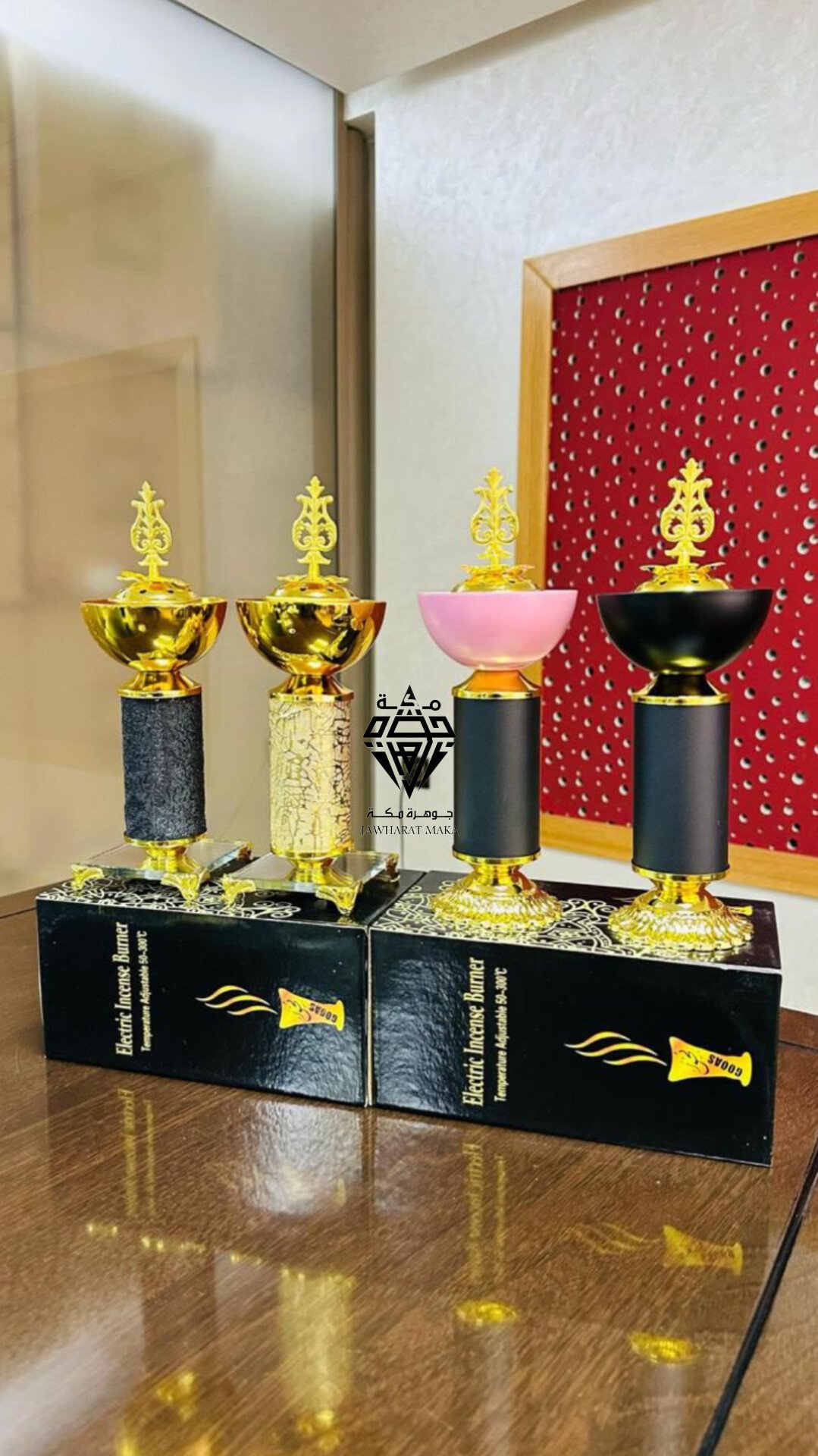 مباخر كهربائية فاخرة بتصميم عصري ممزوج بلمسة كلاسيكية أنيقة. تتميز بقاعدة أسطوانية أنيقة تعلوها وعاء ذهبي لامع، مع غطاء مزخرف بتفاصيل راقية تضيف طابعاً ملكياً جذاباً.