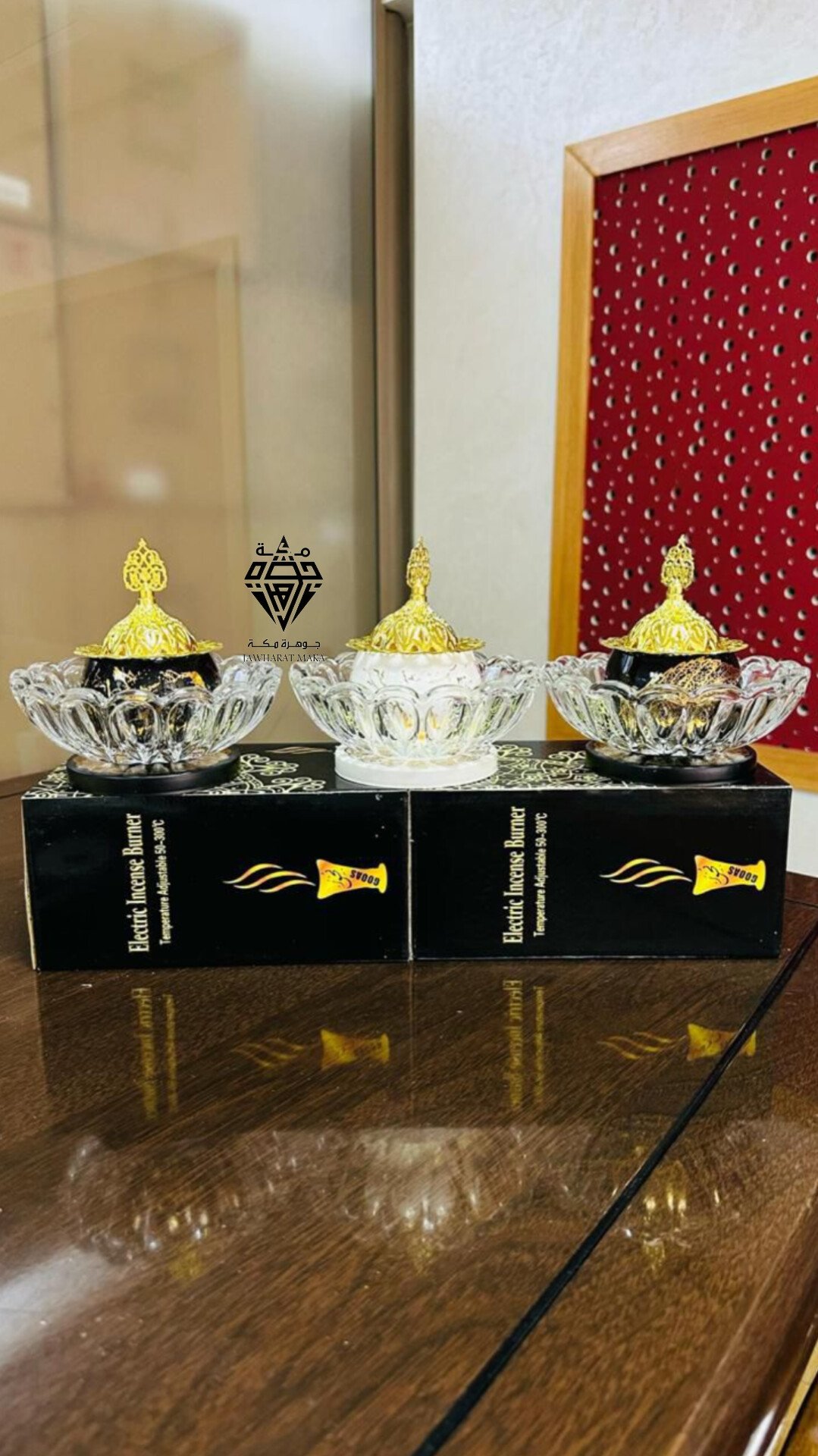 تتميز بتصميم راقٍ يجمع بين الزجاج الشفاف المنحوت واللونين الأسود والأبيض، مع أغطية ذهبية مزخرفة تعطي لمسة فاخرة وتقليدية في نفس الوقت.