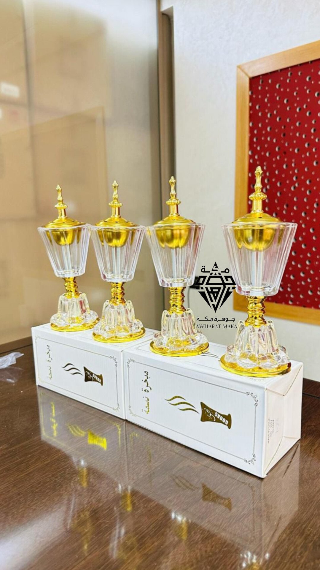 تتميز بشكلها العصري الشبيه بالكأس، مع قاعدة مزخرفة وثابتة تعطيها مظهراً راقياً وفخماً. الجزء العلوي مزين بغطاء ذهبي بلمسة كلاسيكية أنيقة يسمح بخروج دخان البخور بشكل جميل ومنظم.
