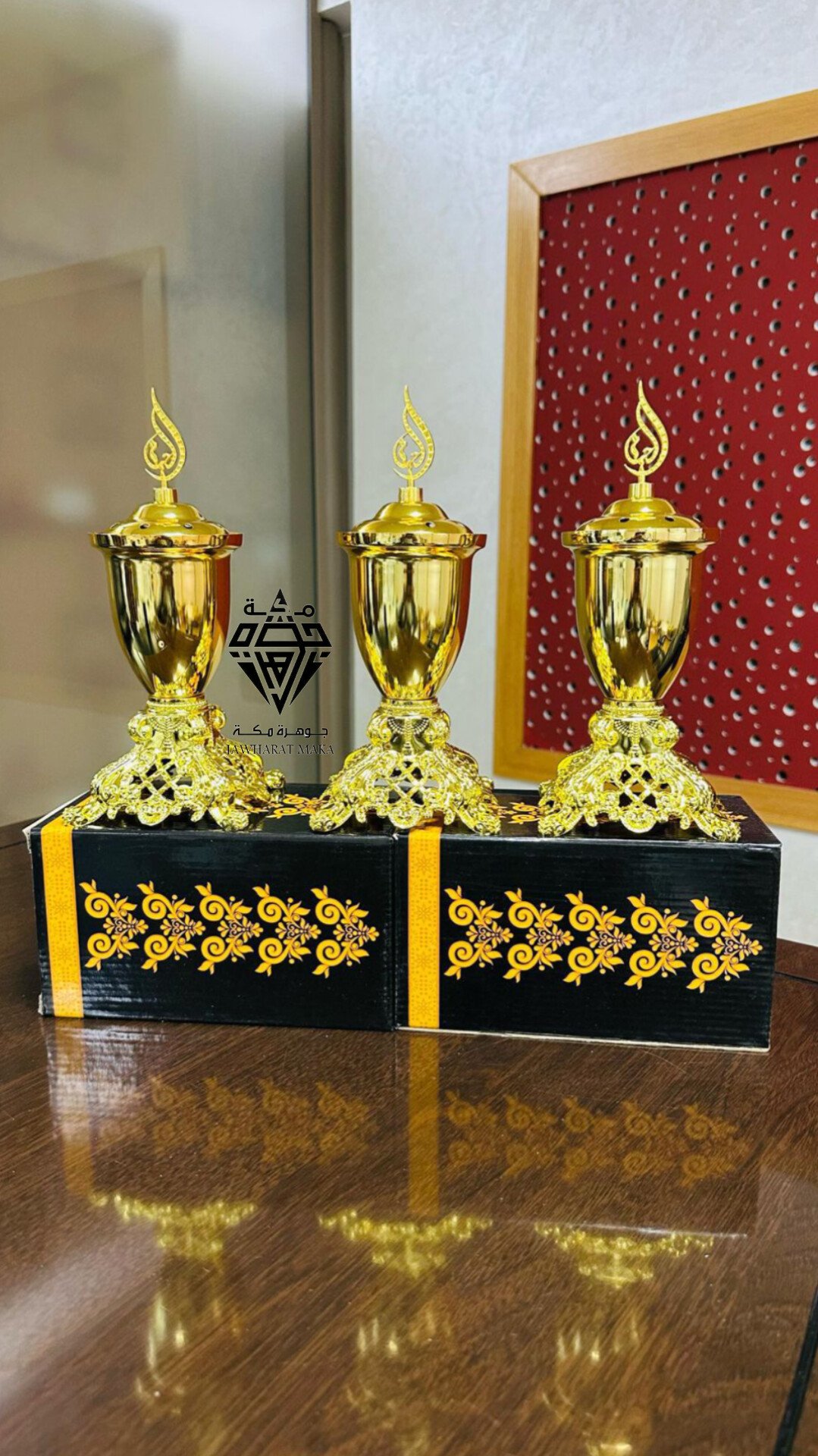 تتميز بتصميم كلاسيكي راقٍ على شكل كأس مرتفع، مع غطاء مزين بتاج علوي على شكل شعلة يزيدها فخامة وجاذبية. الهيكل الخارجي مطلي باللون الذهبي اللامع الذي يمنحها حضوراً قوياً في أي مجلس أو صالون.