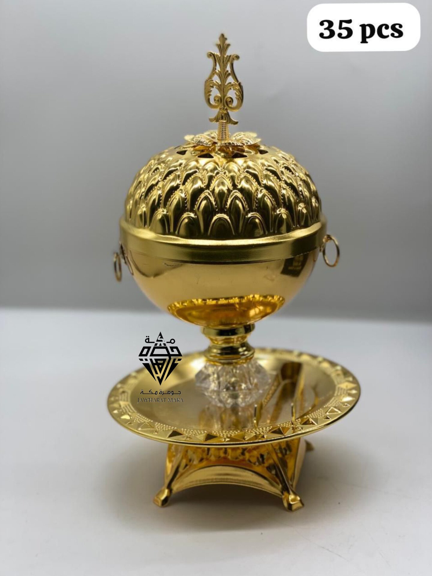 مصنوعة بلون ذهبي لامع، ومنقوشة بزخارف دقيقة تعكس حرفية عالية وذوق راقي. الغطاء مثقوب بنقوش أنيقة كيسمح بانتشار رائحة البخور بشكل متوازن وجذاب، وكيزيدها جمال المقبض العلوي المزخرف.
