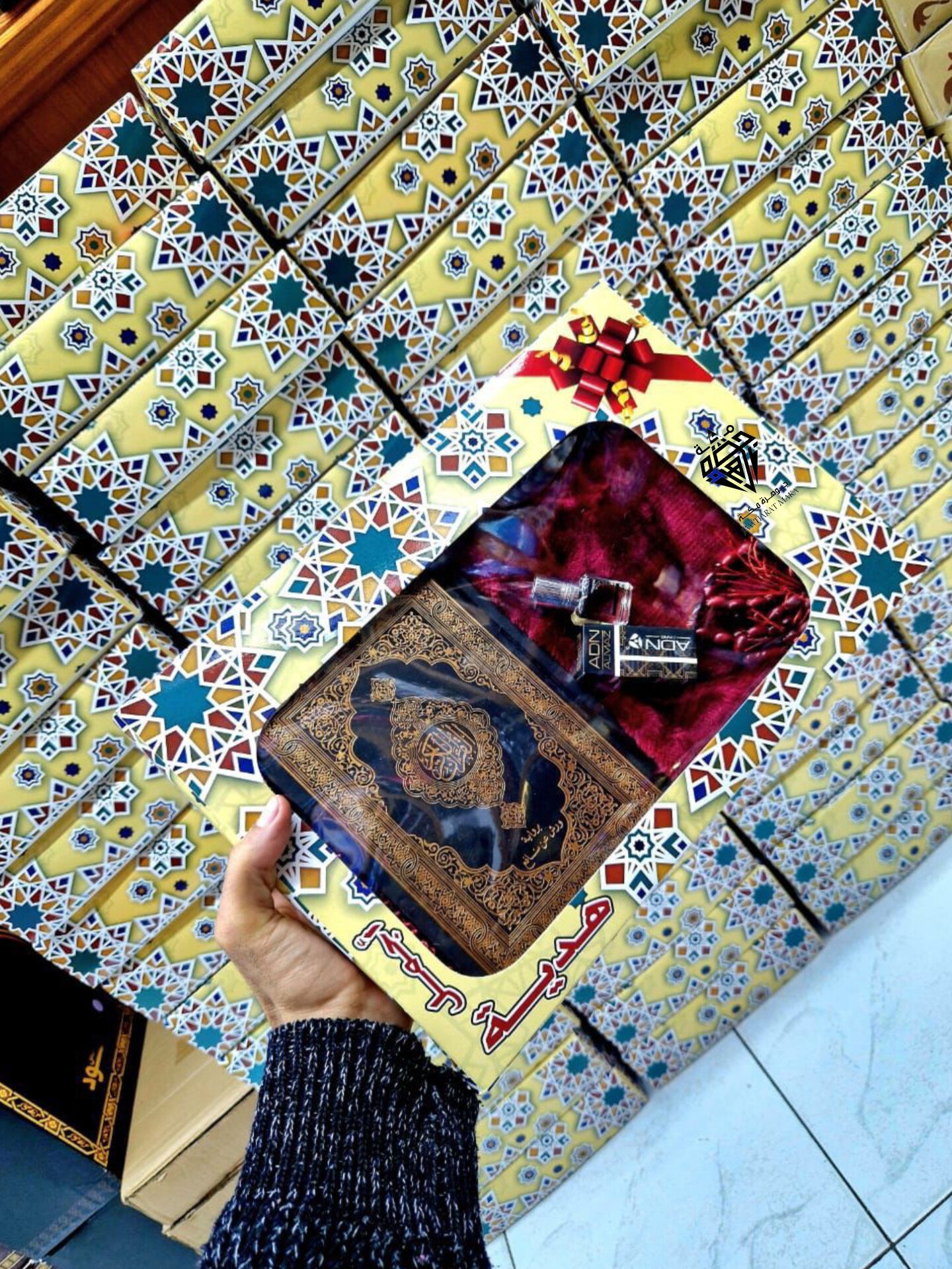 تضم مصحفًا شريفًا بغلاف أنيق مزخرف باللونين الأزرق والذهبي، إلى جانبه زجاجة عطر مركّز بتغليف فاخر، ما يمنح الهدية طابعًا روحانيًا مميزًا ولمسة من الأناقة.